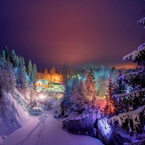 Горный парк «Рускеала» — визитка Карелии! Здесь есть мраморный каньон — в конце XVIII в. здесь добывали мрамор для дворцов Петербурга, позже карьер постепенно наполнился естественными водами. Только представьте: озеро с отвесными берегами из настоящего мрамора, а вокруг растут хвойные деревья. А зимой, когда снежно и включается цветная подсветка, место выглядит по-настоящему сказочно!