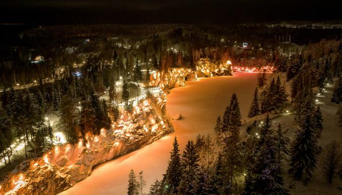 Горный парк «Рускеала» — визитка Карелии! Здесь есть мраморный каньон — в конце XVIII в. здесь добывали мрамор для дворцов Петербурга, позже карьер постепенно наполнился естественными водами. Только представьте: озеро с отвесными берегами из настоящего мрамора, а вокруг растут хвойные деревья. А зимой, когда снежно и включается цветная подсветка, место выглядит по-настоящему сказочно!