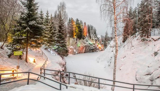 Горный парк «Рускеала» – главная круглогодичная достопримечательность Карелии. Территория горного парка огромна. Центром интереса является Мраморный каньон – большое, вытянутое с юга на север озеро с кристально чистой водой и отвесными берегами, состоящими из настоящего мрамора. Именно здесь когда-то добывали этот декоративный камень для отделки архитектурных шедевров Санкт-Петербурга. А благодаря темнеющим хвойным деревьям, снежному убранству и цветной подсветке на скалах пейзаж получается действительно сказочным!