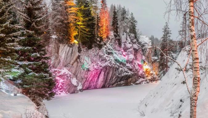 Горный парк «Рускеала» – главная круглогодичная достопримечательность Карелии. Территория горного парка огромна. Центром интереса является Мраморный каньон – большое, вытянутое с юга на север озеро с кристально чистой водой и отвесными берегами, состоящими из настоящего мрамора. Именно здесь когда-то добывали этот декоративный камень для отделки архитектурных шедевров Санкт-Петербурга. А благодаря темнеющим хвойным деревьям, снежному убранству и цветной подсветке на скалах пейзаж получается действительно сказочным!