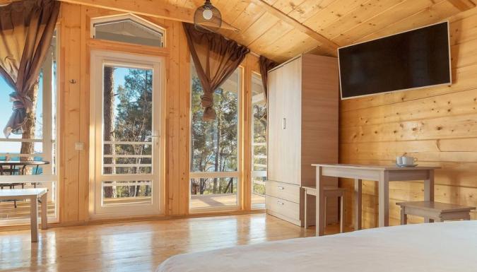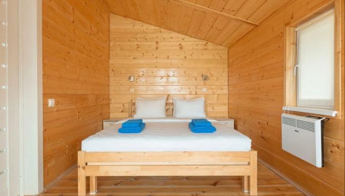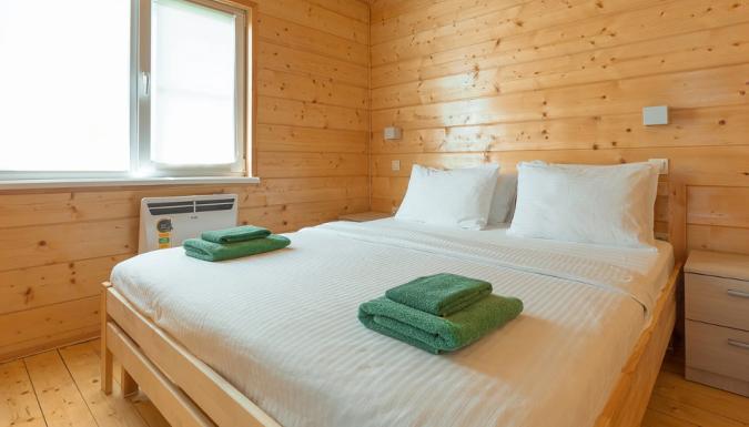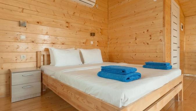 Коттедж 2-комнатный, площадь 40 кв.м., терраса 18 кв.м. Максимальное размещение 4 человека + 1 доп.место. Изолированная комната (спальня) + одна общая комната-гостиная. Двуспальная кровать (1600х2000); Раскладной диван (1500х1800); Мини-кухня с варочной панелью, чайником и необходимым набором посуды; Холодильник; ТВ и Интернет; Кондиционер, Отопление; Обеденная группа в коттедже и на террасе; Ванная комната (душ с горячей водой/туалет).