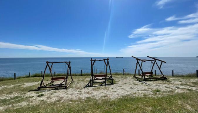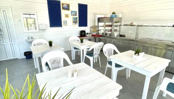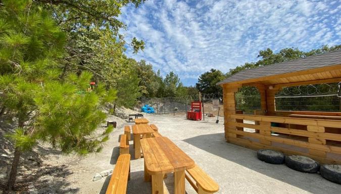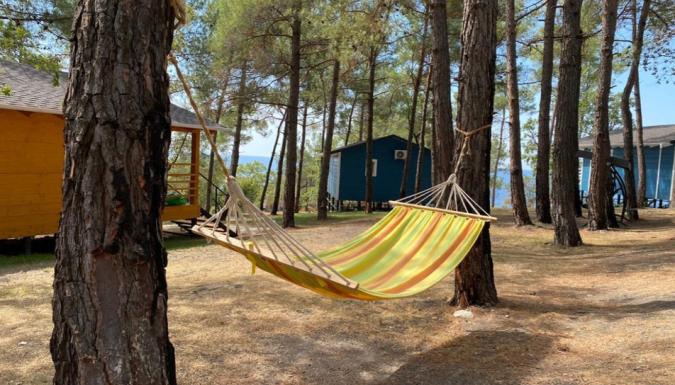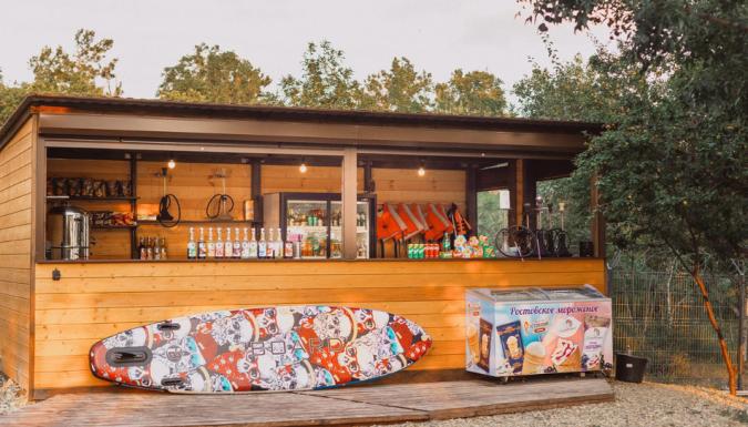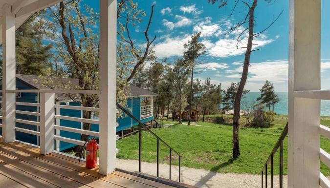 На территории: собственный галечный пляж (80 м), русская баня на дровах, кафе, мангальная зона (мангал, сетки в наличии), детские и спортивные площадки, прокат велосипедов. Гостям предоставляется бесплатная охраняемая парковка, бесплатный Wi-Fi на всей территории и трансфер (платный).