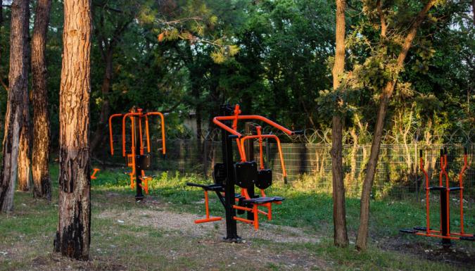 Спортивная площадка оборудована тренажерами, находится в теневой зоне