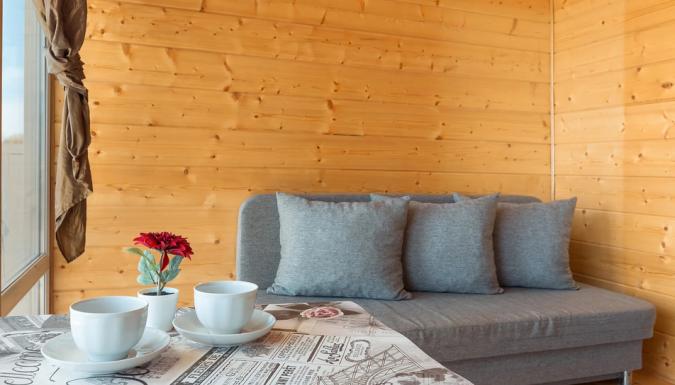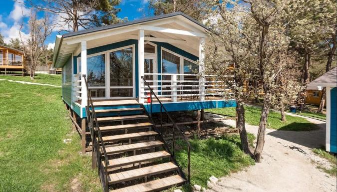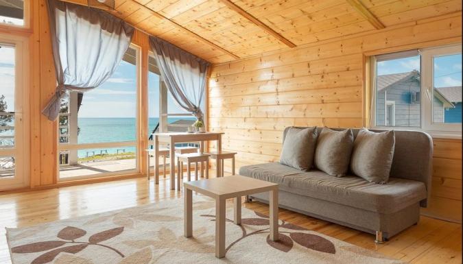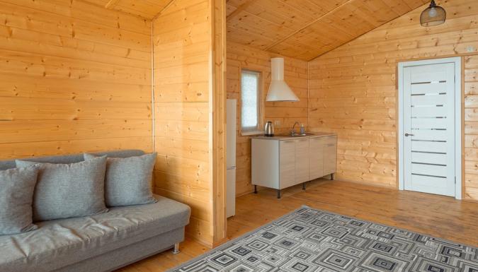 Коттедж 2-комнатный, площадь 40 кв.м., терраса 18 кв.м. Максимальное размещение 4 человека + 1 доп.место. Изолированная комната (спальня) + одна общая комната-гостиная. Двуспальная кровать (1600х2000); Раскладной диван (1500х1800); Мини-кухня с варочной панелью, чайником и необходимым набором посуды; Холодильник; ТВ и Интернет; Кондиционер, Отопление; Обеденная группа в коттедже и на террасе; Ванная комната (душ с горячей водой/туалет).