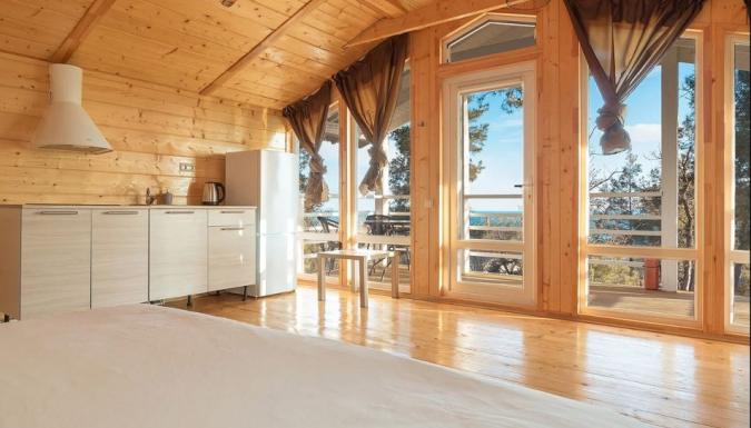 Коттедж Студио, площадь 28 кв.м., терраса 12 кв.м. Максимальное размещение 2 человека + 1 доп.место. Двуспальная кровать (1600х2000); Мини-кухня с варочной панелью, чайником и необходимым набором посуды; Холодильник; ТВ и Интернет; Кондиционер, Отопление; Обеденная группа в коттедже и на террасе; Ванная комната (душ с горячей водой/туалет).