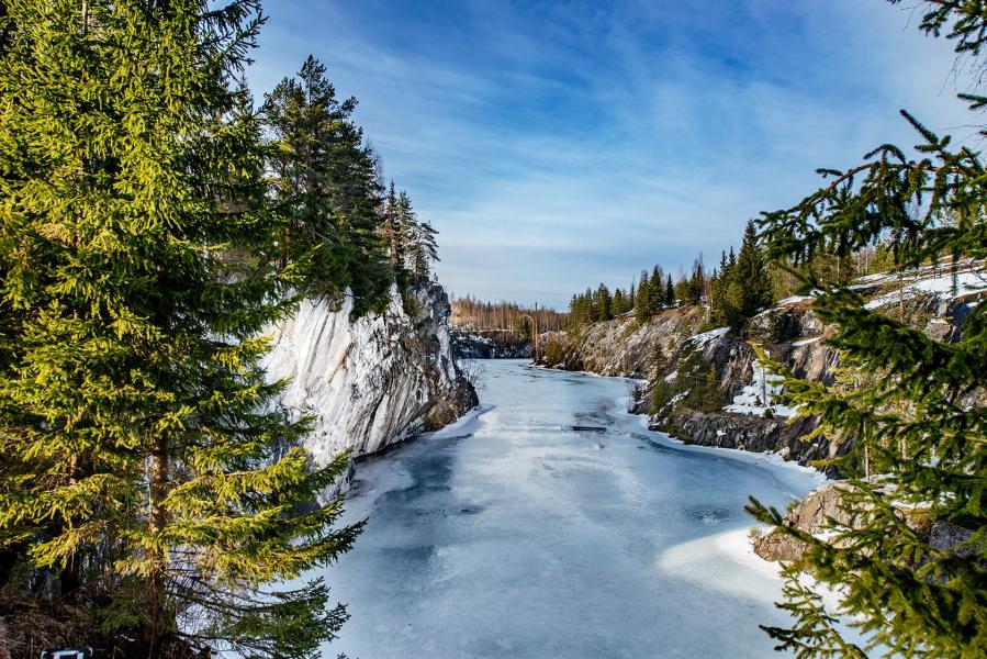Прогулка по горному парку «Рускеала». Горный парк «Рускеала» — это грунтовые воды изумрудного цвета, причудливые очертания отвесных скал, таинственные штольни и гроты. Здесь есть мраморный каньон — в конце XVIII века здесь добывали мрамор для дворцов Петербурга, а потом карьер постепенно наполнился естественными водами.