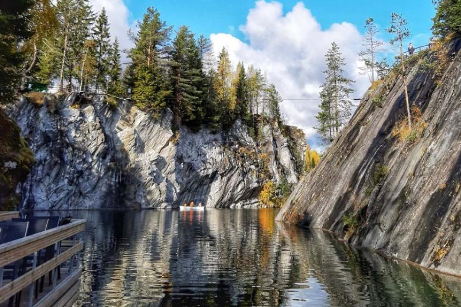 Прогулка по горному парку «Рускеала». Горный парк «Рускеала» — это грунтовые воды изумрудного цвета, причудливые очертания отвесных скал, таинственные штольни и гроты. Здесь есть мраморный каньон — в конце XVIII века здесь добывали мрамор для дворцов Петербурга, а потом карьер постепенно наполнился естественными водами.