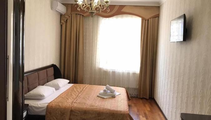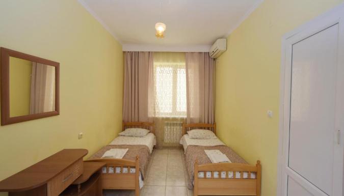 4-х местный: душ, туалет, кондиционер, телевизор, холодильник. 2-х спальная кровать и две односпальных. Номера есть с балконом и без балкона.