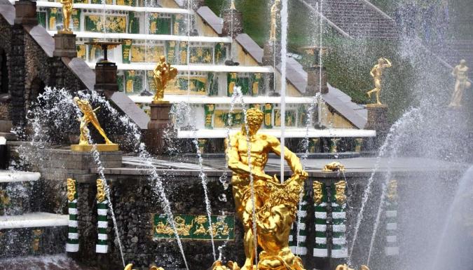 Отправляемся на загородную экскурсию в Петергоф. Это дворцово-парковый ансамбль с фонтанами и статуями античных богов, покрытых золотом. Вся вода из фонтанов идет самотеком без использования насосов.