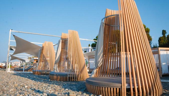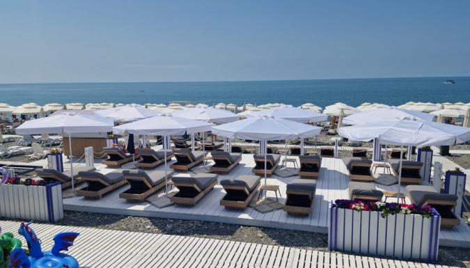 Расстояние до моря составляет 800 метров. Пляж собственный, мелкогалечный. На пляже предусмотрены все удобства для комфортного отдыха: шезлонги, скамейки, зонты, спасательный пункт, душевые. - 11–12