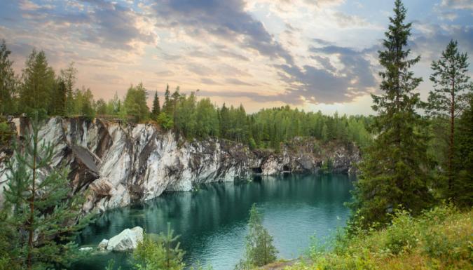 Нас ждет пешеходная прогулка по горному парку Рускеала. Да, именно здесь располагается визитка Карелии — мраморный каньон! В конце XVIII века здесь добывали мрамор для дворцов Петербурга, а потом карьер постепенно наполнился естественными водами.