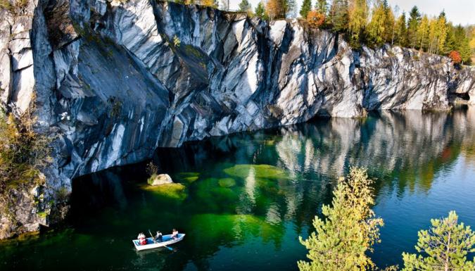 Во время экскурсии вы узнаете историю добычи мрамора, из которого украшали Исаакиевский собор и Зимний дворец. Прогуляетесь по подвесным мостикам, побываете у смотровых площадок с панорамой на изумрудную воду и отвесные скалы. По желанию — можно арендовать катамаран или спуститься в мраморные штольни (за дополнительную плату).
