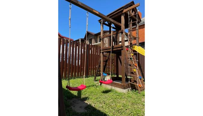 На территории каркасный бассейн, шезлонги, мангал, кухня для самостоятельного приготовления со всем необходимым. Детская площадка (горка, батут), зона для игр.