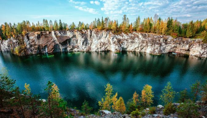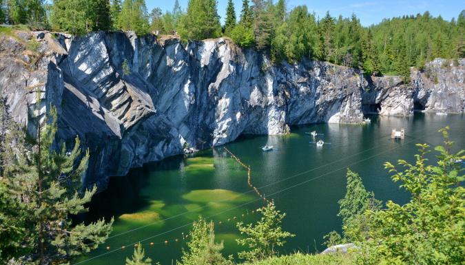 Прогулка по горному парку «Рускеала» (входные билеты оплачиваются дополнительно). Горный парк «Рускеала» — это грунтовые воды изумрудного цвета, причудливые очертания отвесных скал, таинственные штольни и гроты. Здесь есть мраморный каньон — в конце XVIII века здесь добывали мрамор для дворцов Петербурга, а потом карьер постепенно наполнился естественными водами.