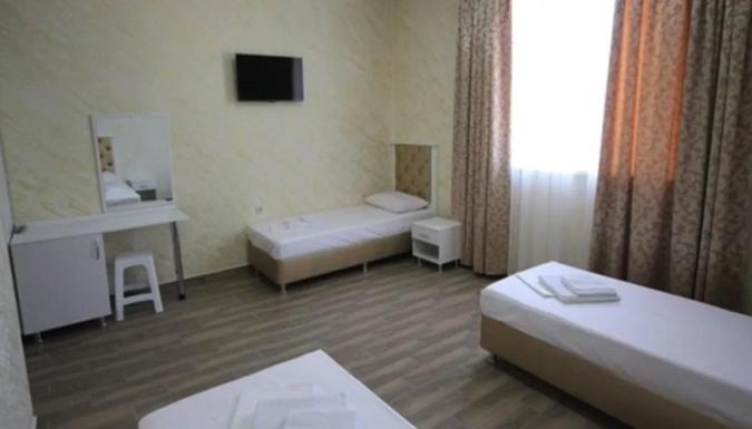 3-х местный номер без балкона: душ, туалет, кондиционер, телевизор, холодильник. 2-х спальная кровать и односпальная.