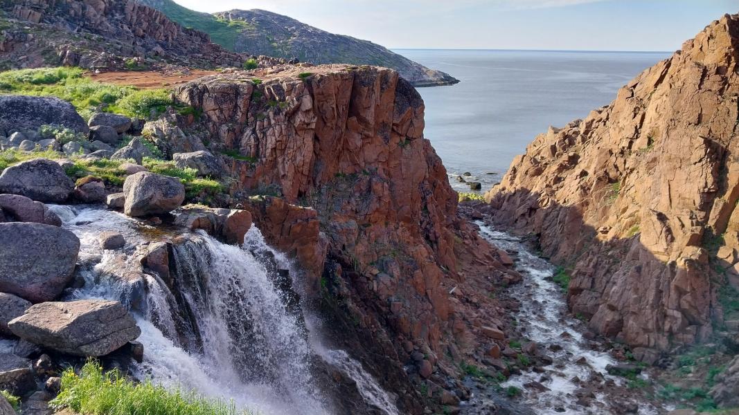 Батарейский водопад. Шумные потоки воды на фоне рубиновых скал — это невероятное зрелище! Насладившись им, мы поднимемся на соседний холм и полюбуемся невероятной панорамой Баренцева моря и Малого Батарейского озера.
