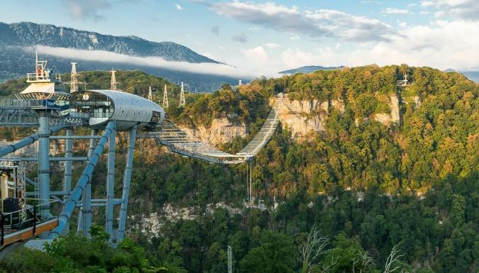 Один из самых протяженных пешеходных мостов в России (439 м), раскинувшийся над рекой Мзымта. С высоты (207 м) открывается потрясающий вид на величественные Кавказские горы и живописное Черноморское побережье. Скай - бридж отвечает самым высоким требованиям безопасности. Согласно проекту, он может одновременно вынести землетрясение, штормовой ветер и сильные дожди с последующим обледенением.