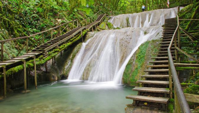 Далее вы садитесь на машины «Газ-66», которые провозят вас по реке Шахе к каскаду водопадов. 12 из 33 водопадов оборудованы деревянными настилами и перилами, по которым вы сможете погулять и полюбоваться красотами колхидского леса. Желающие могут поплавать в купальных чашах, которые образовывает падающая вода. Это удивительное творение природы подарит множество незабываемых впечатлении.