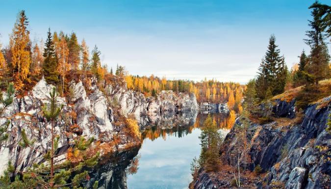 Прибытие в Рускеалу. Горный парк Рускеала – молодая достопримечательность Карелии, ставшая ее визитной карточкой менее чем за 10 лет. Здесь есть всё, чтобы отдохнуть от суеты большого города и насладиться умиротворяющим действием карельской природы: свежий таёжный воздух, зелёные кроны хвойных деревьев, прозрачные воды мраморного каньона.