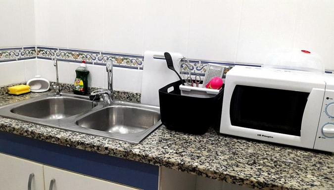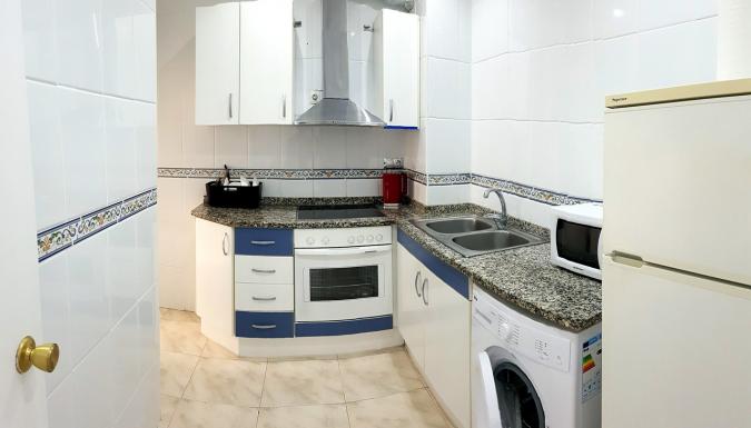 Кухня полностью оборудована: холодильник, морозильная камера, плита с духовкой, вытяжка, микроволновая печь, чайник, посуда/приборы, кухонные принадлежности, стиральная машина.
