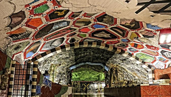 В Стокгольме находится самое необычное в мире метро. По-другому его называют «самая длинная художественная галерея в мире». Такое название стокгольмское метро получило за счёт необычного дизайна. Каждая станция оформлена и украшена по-своему. Здесь мы найдём и сказочные гроты, и греческие скульптуры, и уголки классической архитектуры, и настенные рельефы, и поп-арт (на одной из станций к потолку прибиты огромные башмаки), и фонтаны, и ручьи. Наш маршрут пройдет по синей ветке и захватит несколько самых необычных и интересных станций. Мы узнаем, почему метро в Швеции обозначается буквой “T”, почему некоторые вагоны имеют уникальные имена (например, Ivan или Maria), а также историю станции-призрака. - 4