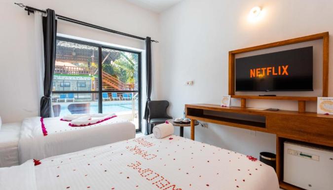 Балкон или терраса, спутниковое ТВ. удобства в номере, чайник, сейф, кондиционер, холодильник. доставка еды и напитков в номер, мини-бар. Пляжные полотенца можно взять на ресепшн