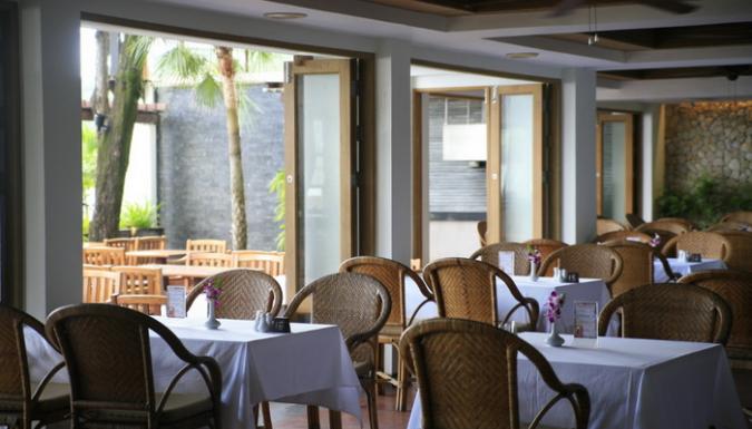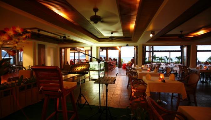 В ресторане, где для гостей подают блюда интернациональной кухни, звучит живая музыка.