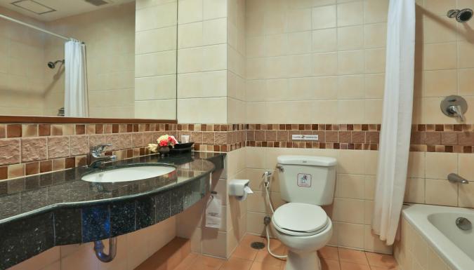 • пол в спальне – керамическая плитка • кондиционер • ТВ (есть 3 русскоязычных канала) • Wi-Fi (бесплатно) • телефон • сейф • стол • мини-холодильник • 2 бут.воды ежедневно бесплатно • набор для приготовления чая/кофе • ванна в ванной (с туалетными принадлежностями) • фен • балкон
