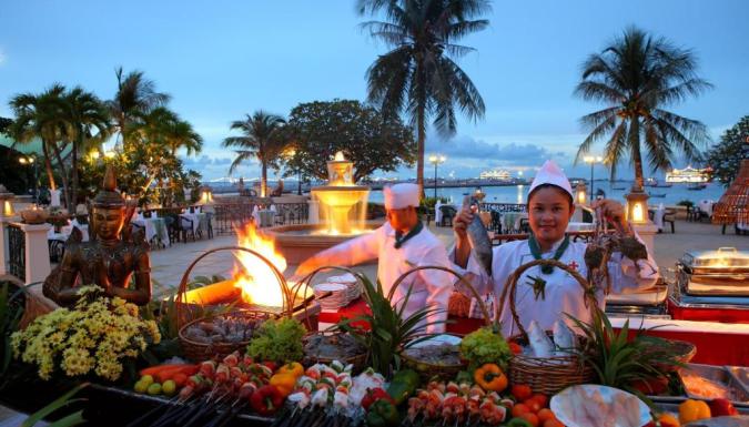 В круглосуточном ресторане Sunrise Sunset подают блюда интернациональной кухни и завтрак «шведский стол». На территории отеля работают тайский ресторан Siam Elephant, китайский и рыбный ресторан Bali-Hai и ресторан морепродуктов BBQ Terrace. Напитки можно заказать в одном из 4 баров отеля.