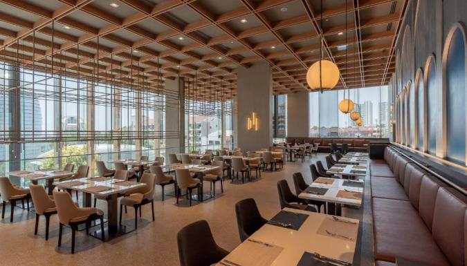 В ресторане подают блюда американской, итальянской, японской и тайской кухни, а также вегетарианские и безглютеновые блюда. На завтрак предлагаются местные деликатесы, свежая выпечка и разнообразные напитки.