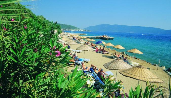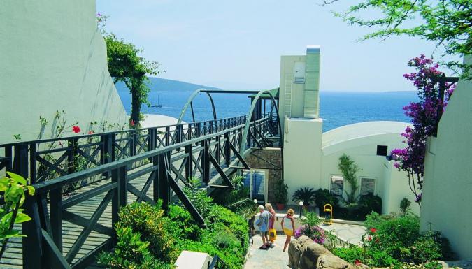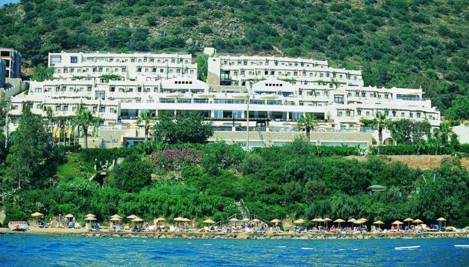 в 35 км от аэропорта и в 1,5 км от центра Бодрума, через подземный переход к собственному пляжу.