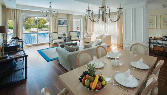 Family Suite: 40 номеров площадью 80 м², расположенных в главном здании. Номера состоят из 2 спальных комнат и 2 ванных комнат с душем. В одной из комнат двуспальная кровать, в другой 2 односпальных кровати. В каждой комнате мини-бар, набор для приготовления чая и кофе, для детей 0.2 литровая упаковка молока и прибор для подогрева детской смеси, LED TV, телевизионные каналы, подключение к интернету, прямой телефон, центральный кондиционер, сейф. В ванной комнате душ и туалет, весы, зеркало для макияжа, фен, халаты и тапочки. Паркетное покрытие в комнатах и мраморное - в ванной комнате. Балкон.