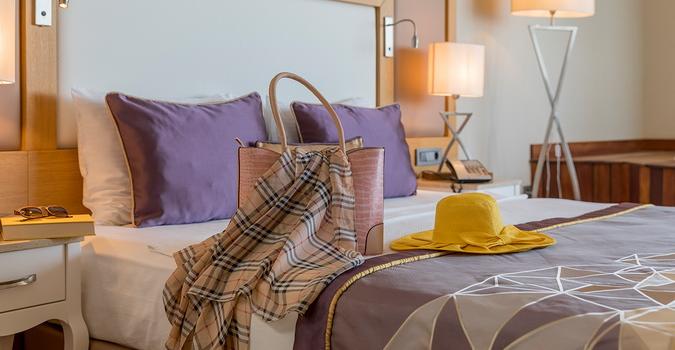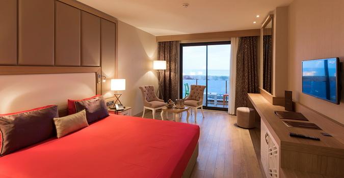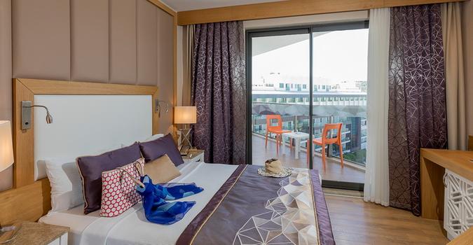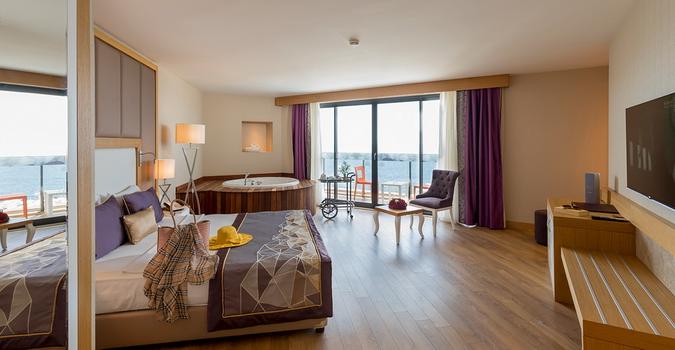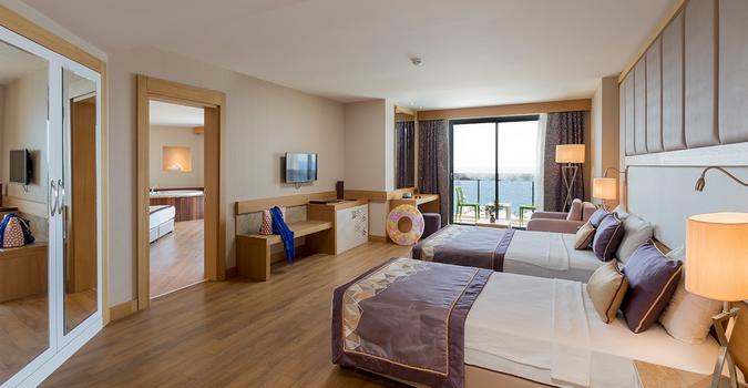 Номера класса Люкс: 2 спальни, 2 ванные комнаты. В номере имеются: 2 двуспальные и 1 односпальная кровати, 1 кресло-кровать и джакузи. Общая площадь - 100 м², включая 2 балкона. Размещение максимум 5 взрослых и 1 ребенок.