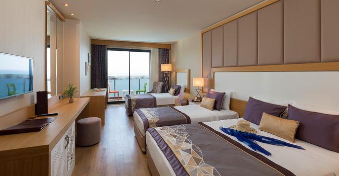 Номера с большой площадью: в данных номерах имеется 1 двуспалья кровать и 2 односпальные кровати. Размещение: максимум 3 взрослых т 1 ребенок, или 2 взрослых и 2 ребенка. Это один большой номер площадью 45 м², включая балкон.