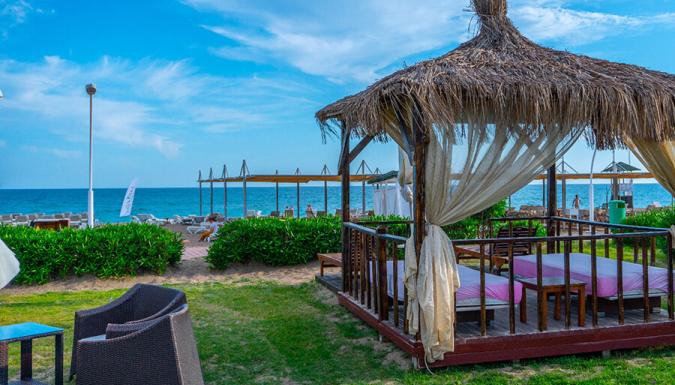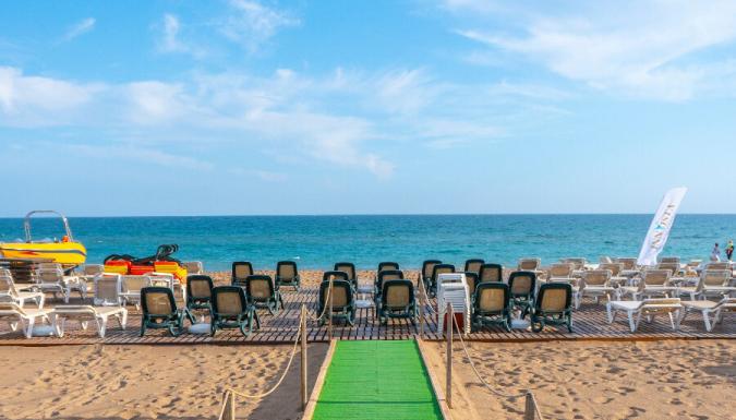 На пляже для туристов установлены зонтики, шезлонги, матрасы: бесплатно. От отеля курсирует бесплатный автобус до пляжа.