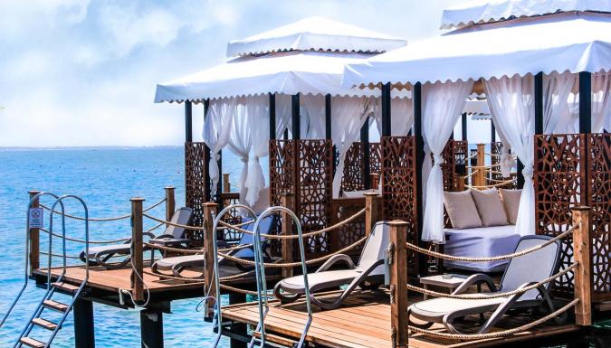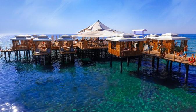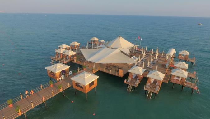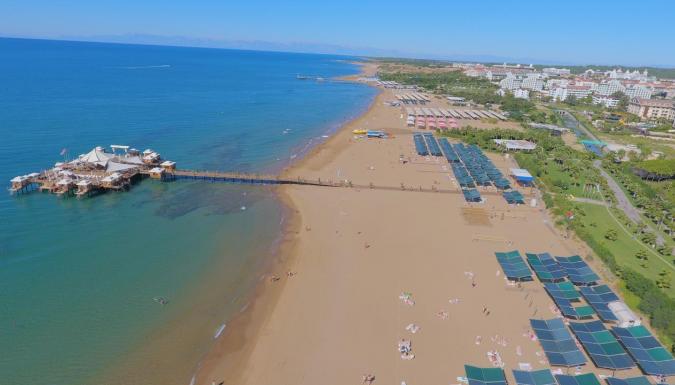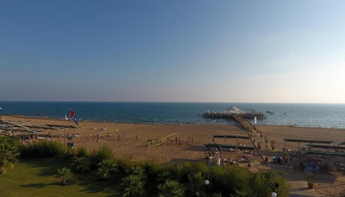Собственный песчаный пляж находится рядом с отелем. Шезлонги, матрацы, зонтики, пляжные полотенца - бесплатно. Заход в море - пологий, песок. Кабины для переодевания, душ, спасатели. Пирс с баром и павильонами (платно).