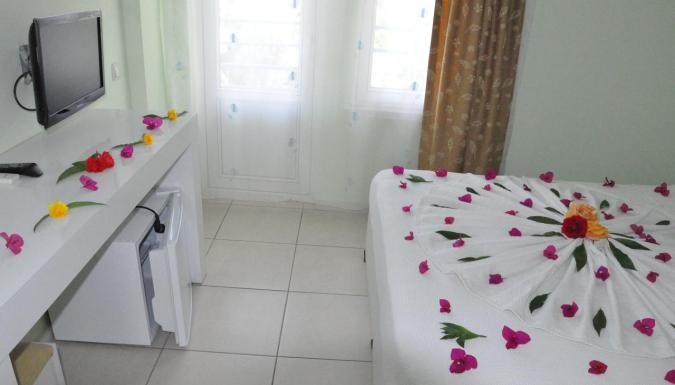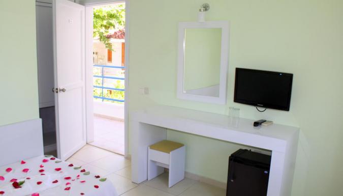 Индивидуальный кондиционер, спутниковое ТВ с российским каналом, прямой телефон, музыкальный канал, интернет, ванна, фен, балкон, сейф, дополнительная кровать (по запросу), мини-бар (пустой).
