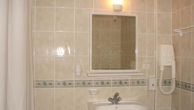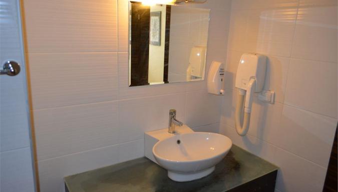 - ванная комната с душевой кабиной, феном и туалетными принадлежностями.