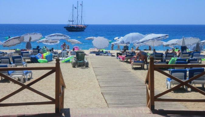 Пляж находится в 150 м от отеля. Шезлонги, зонтики, матрацы, пляжные полотенца - платно.