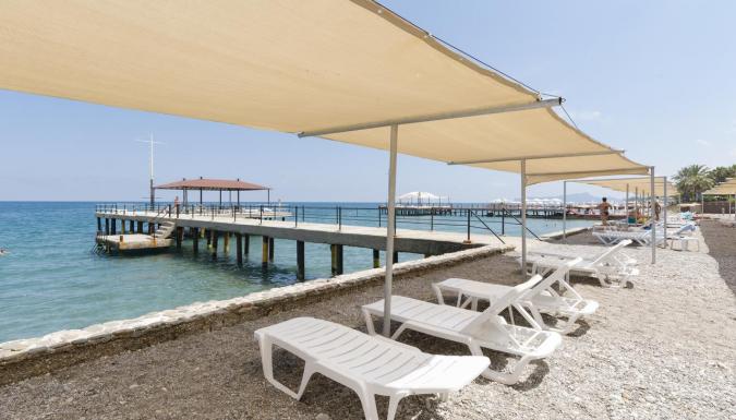 Собственный галечный пляж находится рядом с отелем. Протяженность пляжа составляет 60 м. Шезлонги, зонтики - бесплатно, матрацы, пляжные полотенца - платно. Заход в море - галька, камни, бетонный пирс. Душ, спасатель на пляже, кабины для переодевания.