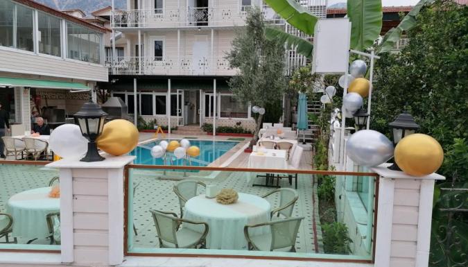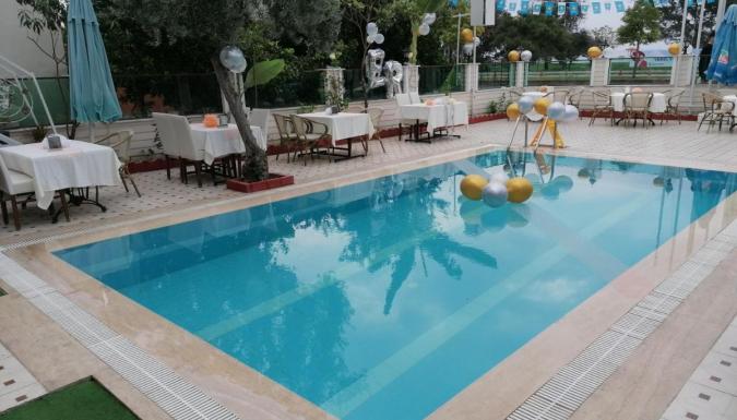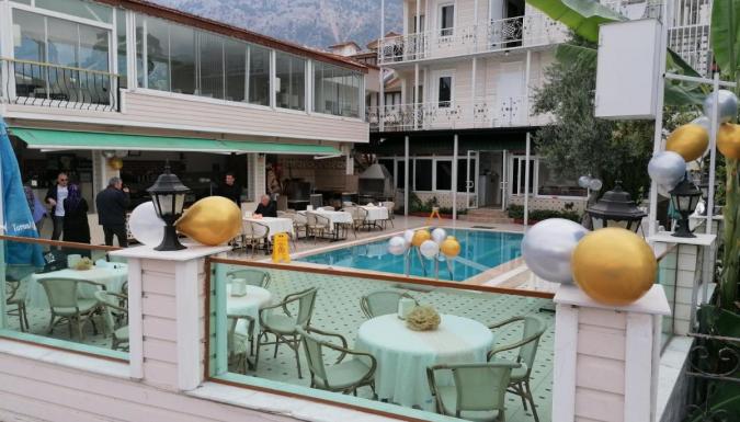 Отель в 40 км от аэропорта г. Анталья, в 15 км от г. Кемер, в поселке Бельдиби, в 50 м через дорогу от городского пляжа. Построен в 1995 году, общая площадь 1000 м2, последняя реновация прошла в 2018- 2019 году.