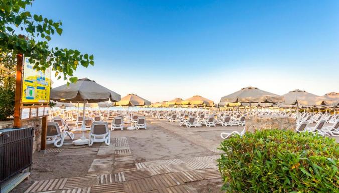 Собственный песчано-галечный пляж находится рядом с отелем.
