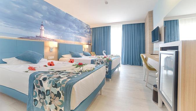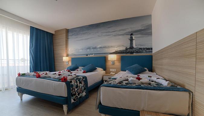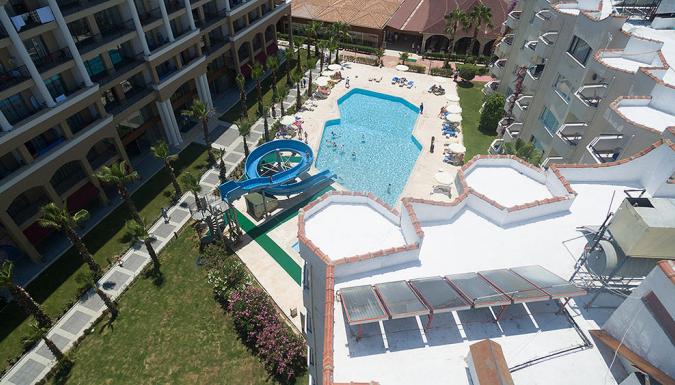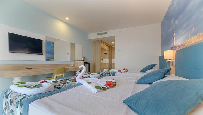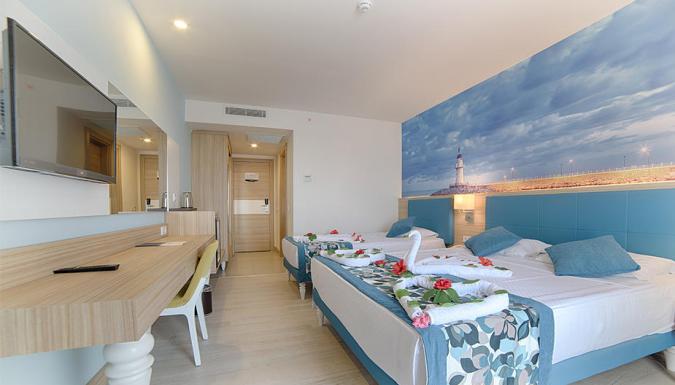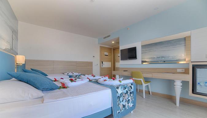 300 номеров, закрытый и открытый бассейны и аквапарк, анимационный персонал, няня, прачечная, химчистка, услуги для инвалидов, фитнес-центр, SPA и здоровительный центр, частный пляж, A'la Carte ресторан.