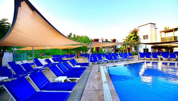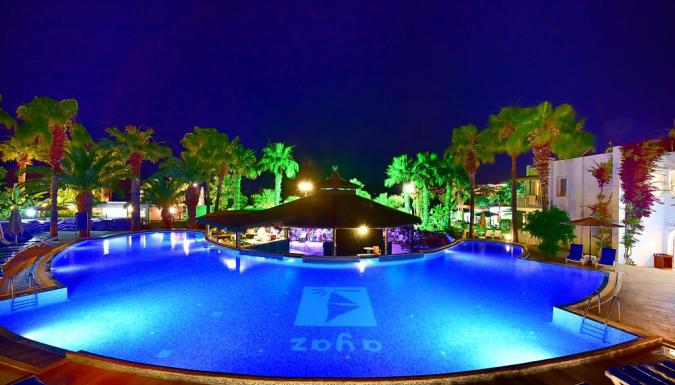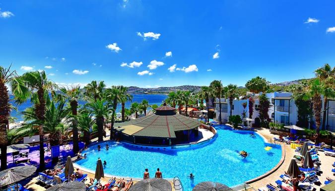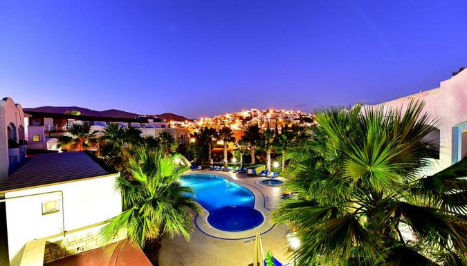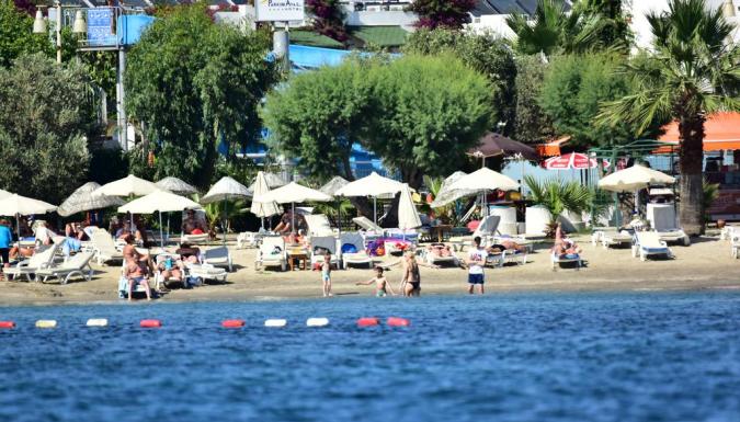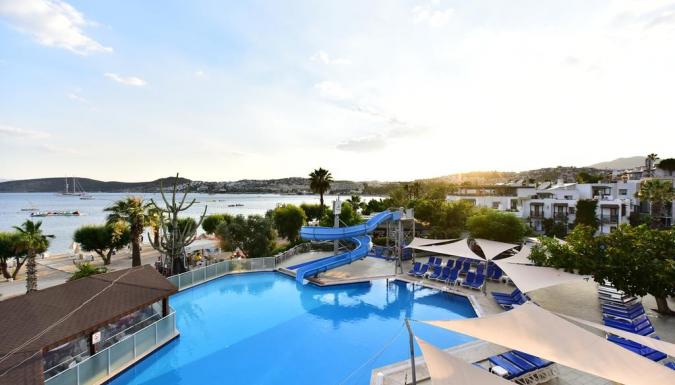 в 40 км от аэропорта и в 3 км от центра Бодрума, в поселке Гюмбет, на берегу моря.
