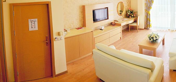 24-часовый сервис (платно), Балкон, Ванна/душ (ванна - в стандартном, душ - в семейном номере), Кондиционер (центральный, часы работы и мощность зависят от погоды - в стандартном номере и Dublex, в семейном - индивидуальный), Радио, Российский ТВ-канал, Телефон, Туалет, Минибар (1,5 л воды), Полотенца, Сейф (Платно), Уборка, Фен