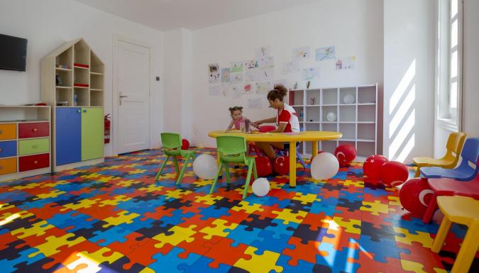 Кроватка, по запросу, детская анимация, мини-клуб (4-12 лет), детские стулья в главном ресторане, детская игровая площадка, детский открытый бассейн с горкой, 12 кв.м, детский крытый бассейн 9 кв.м (подогрев только зимой), няня (платно).