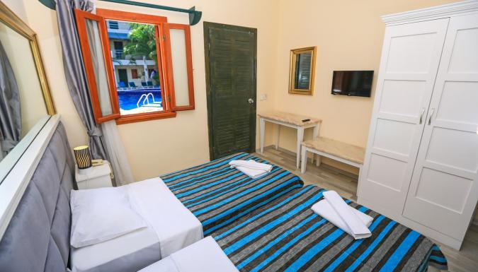 Индивидуальный кондиционер, спутниковое ТВ с российским каналом, телефон, ванная комната, душ, фен, интернет (бесплатно), балкона нет, сейф (платно), дополнительная кровать (по запросу).