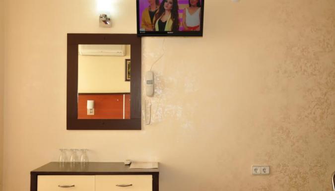Балкон, кондиционер, душ, туалет, полотенца, туалетные принадлежности, фен, телевизор, спутниковое ТВ, телефон, смена постельного белья, уборка в номере.