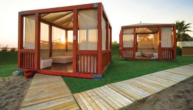 На пляже шезлонги, полотенца, тенты: бесплатно.