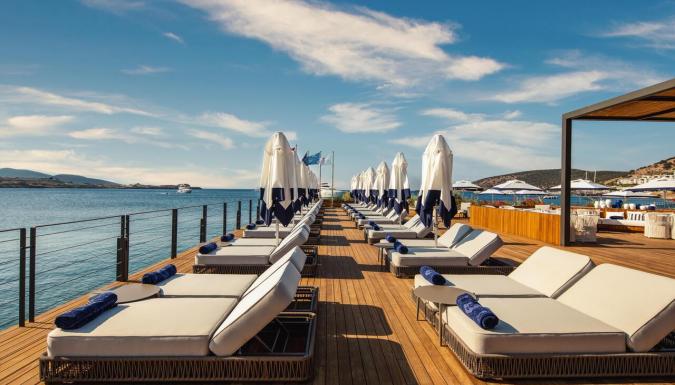 Шезлонги, зонтики, пляжные полотенца - бесплатно. Пирс.